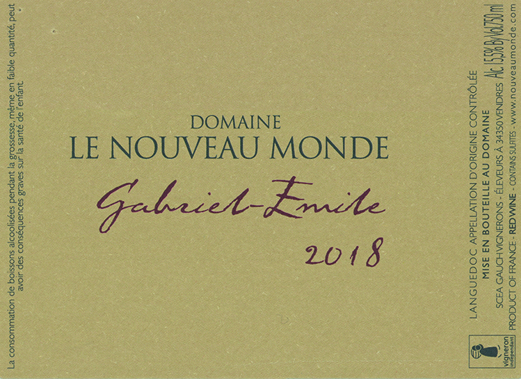 Détail du vin Domaine Le Nouveau Monde Gabriel-émile 2018 rouge